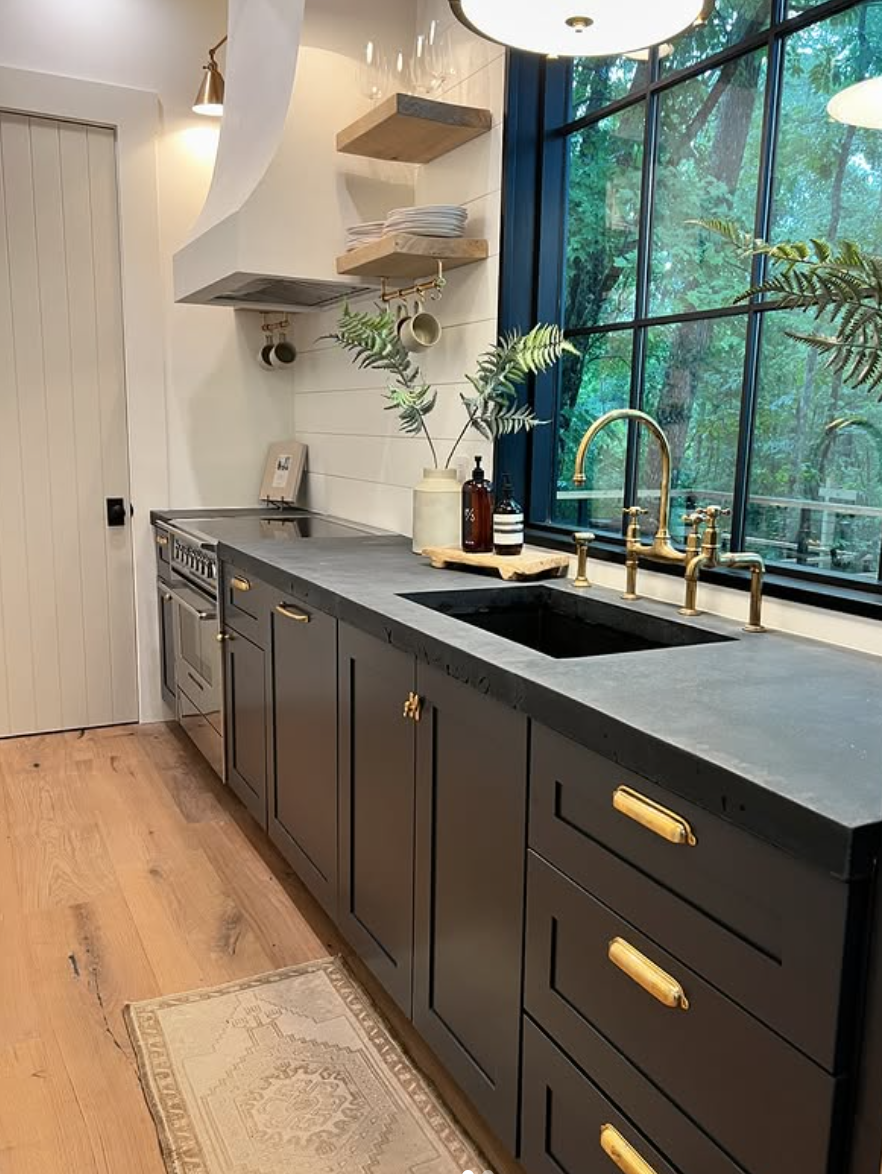 This kitchen design strikes a dramatic balance with deep black cabinetry, gold hardware, and smooth concrete countertops. The oversized window floods the space with natural light, creating a perfect blend of modern and cozy.