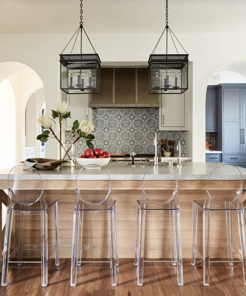 This transitional kitchen strikes the perfect balance between classic and modern, featuring a wood island topped with a smooth concrete countertop. The bold patterned tile backsplash creates a statement wall, while the clear ghost stools keep the look light and airy. Kitchens with concrete countertops like this are ideal for adding texture to a sophisticated design.