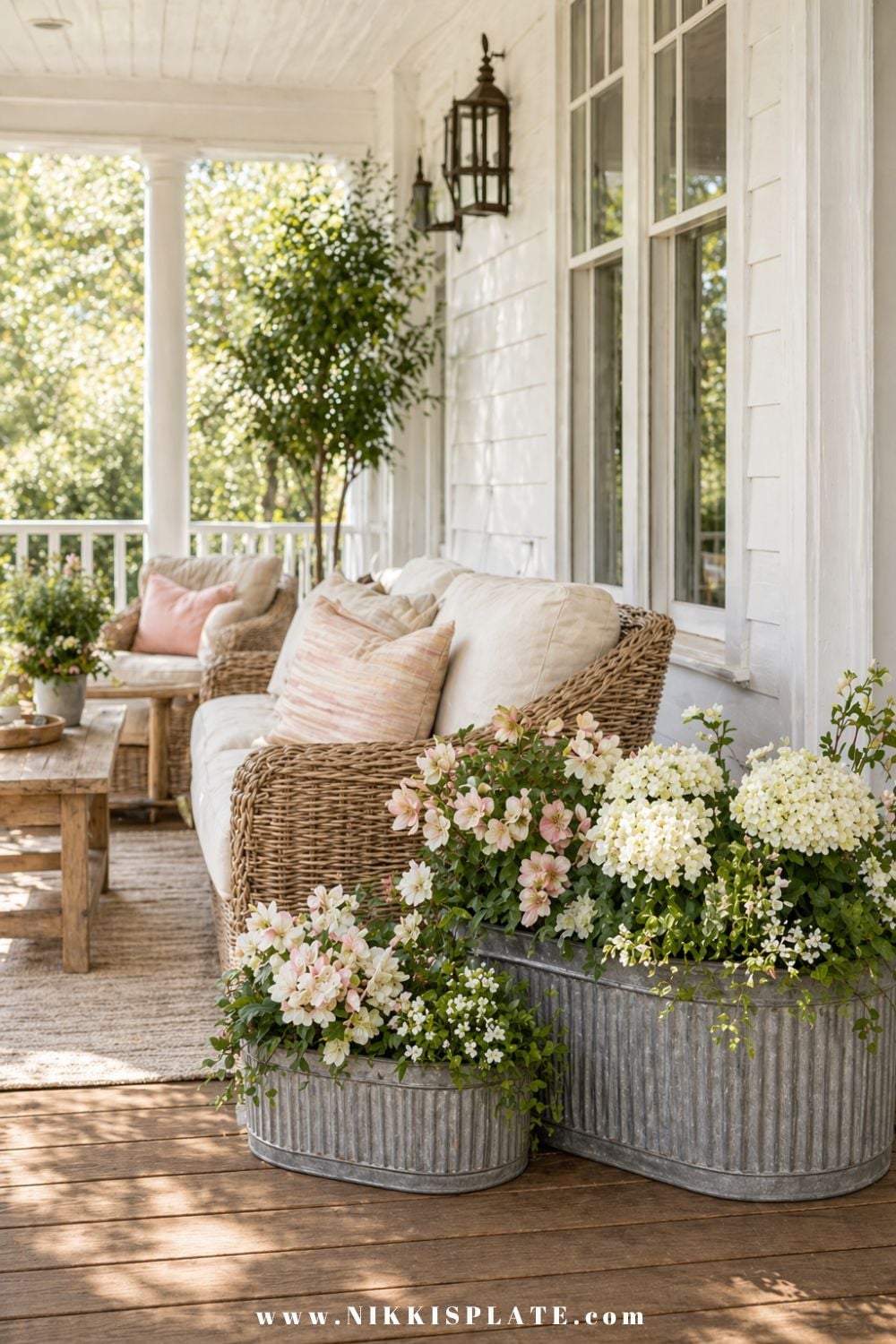 These front porch planter ideas feel effortlessly elevated with the mix of galvanized metal planters and soft, romantic blooms. I love how the combination of hydrangeas and delicate florals adds a fresh, layered look while still keeping everything refined and cohesive. If you're looking for front porch planter ideas with metal planters for a polished outdoor space, this is such a beautiful style to try