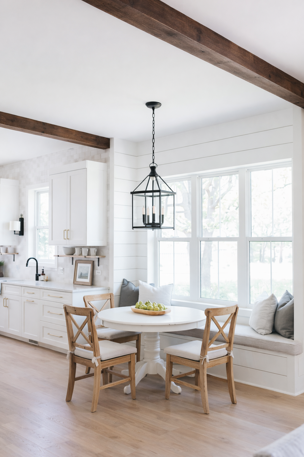 Flexible, functional layouts remain a key part of modern farmhouse design in 2026, with homes prioritizing spaces that adapt to real family life. Purposeful zoning - like built-in breakfast books in kitchens or dining areas - creates cozy, efficient spots for everyday meals, homework, and casual gathering without needing extra square footage. These thoughtful layouts blend practicality with charm, making farmhouse homes feel both inviting and highly livable.